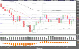 Os 60 minutos mostram que a recuperação de intraday, por enquanto, não passou do simples movimento natural de, após perder o limite inferior do canal de keltner e ser cortado pelo bollinger, o indice se recuperar, indo testar a mme21. Assim, o padrão de queda segue e só começa a ser desmontado caso o índice consiga vencer a mme21 de intraday e passa a dar confiança após o rompimento da mme233.
